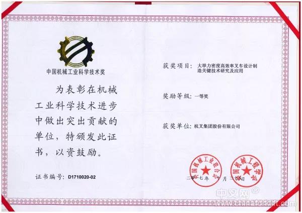 杭叉集團(tuán)榮獲2017年中國機(jī)械工業(yè)科學(xué)技術(shù)獎一等獎