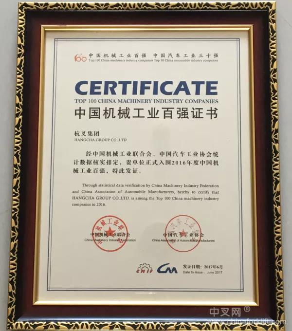 杭叉集團(tuán)榮獲2016年度中國機(jī)械工業(yè)百強(qiáng)企業(yè)的稱號